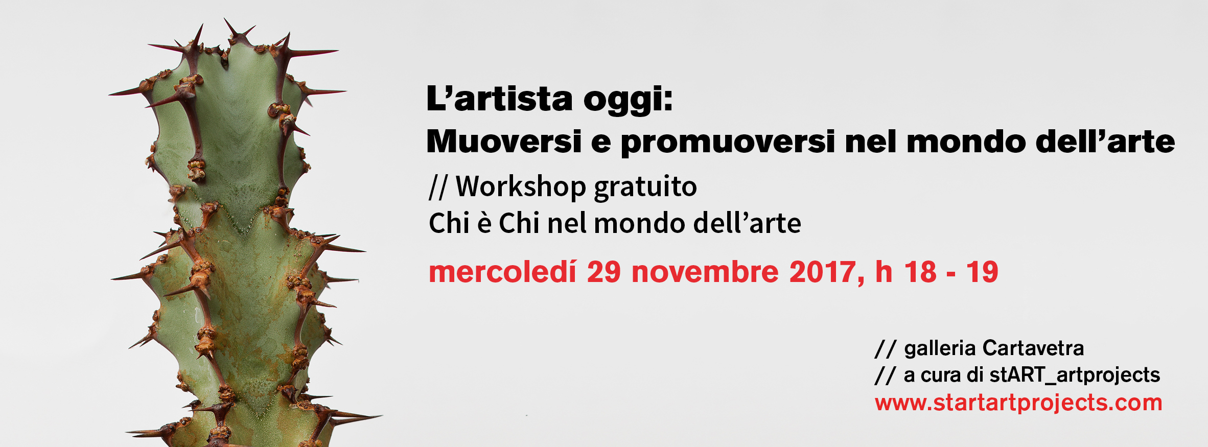 Il workshop fa parte del corso L’ARTISTA OGGI: MUOVERSI E PROMUOVERSI NEL MONDO DELL’ARTE indirizzato agli artisti giovani e non, che desiderano avvicinarsi al mondo dell’arte in modo efficace e professionale e incrementare la loro produzione e il loro cv.