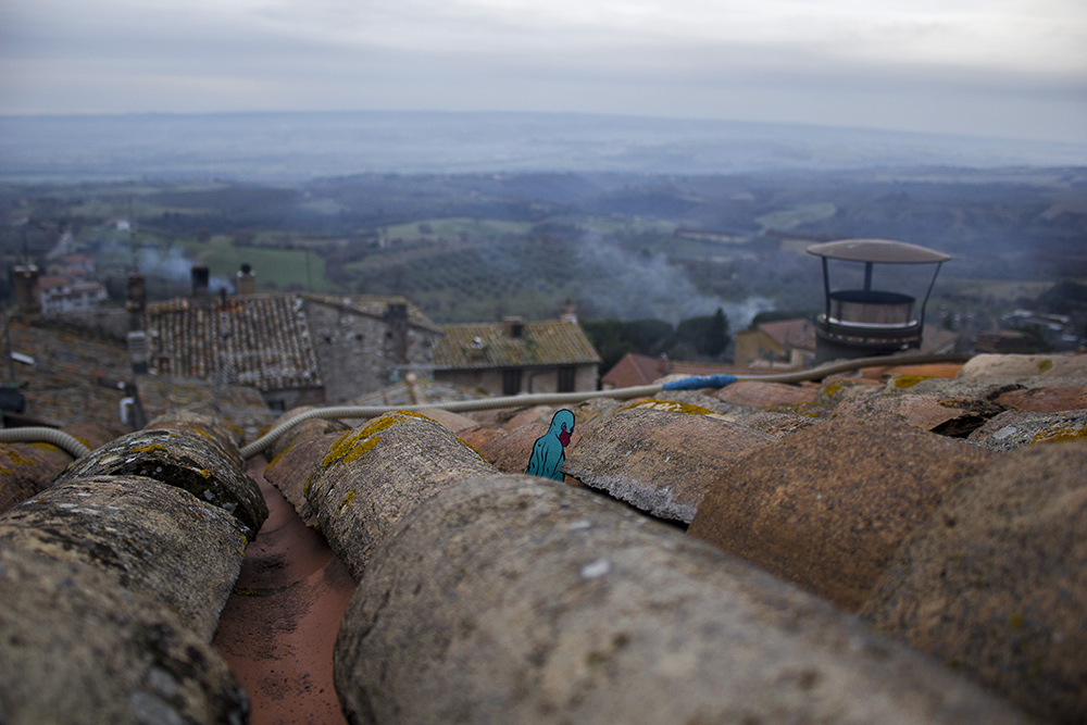 Il progetto ”Trova l’intruso” affronta la questione dell’immigrazione attraverso il rapporto tra un corpo estraneo e l’ambiente circostante. Anche dal punto di vista formale “Trova l’intruso” è un’opera che sviluppa diversi rapporti con lo spazio. Esiste un catalogo fotografico, dove le figure di carta sono inserite in diversi contesti; ma esiste anche una versione installativa, come quella che presento a L’Appartamento che gioca direttamente con lo spazio vissuto dallo spettatore. Il catalogo ha un rapporto più esplicito con il gioco di enigmistica e stimola reazioni diverse. Ogni immagine è stata scattata in un luogo diverso, dalla campagna alla città; spazi aperti dove i miei omini di carta si possono perdere e allo stesso tempo risultano estremamente riconoscibili per le loro fattezze e i loro colori.