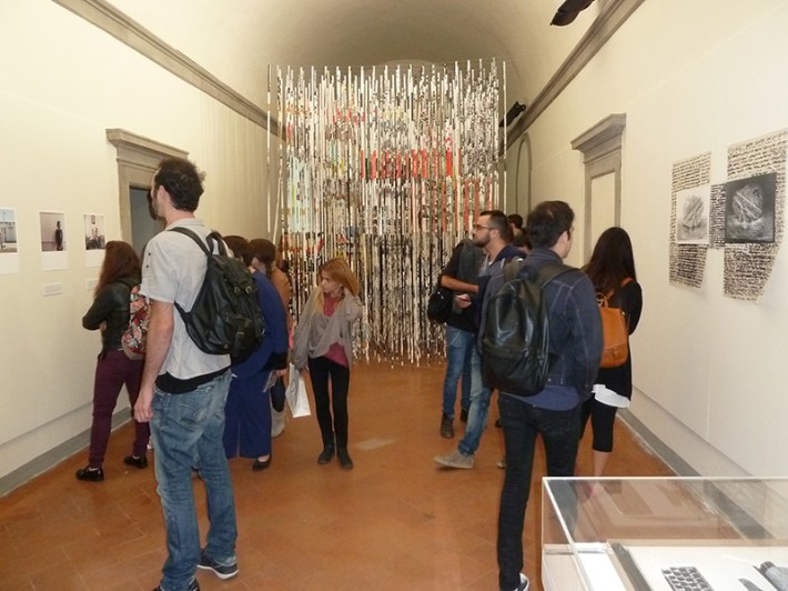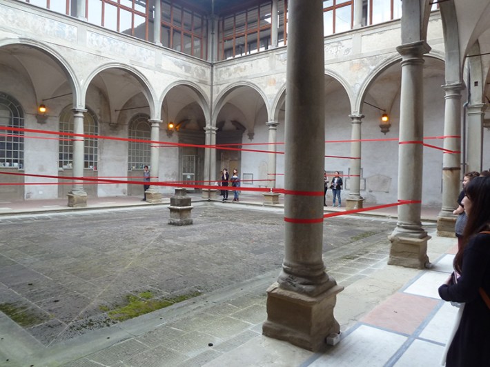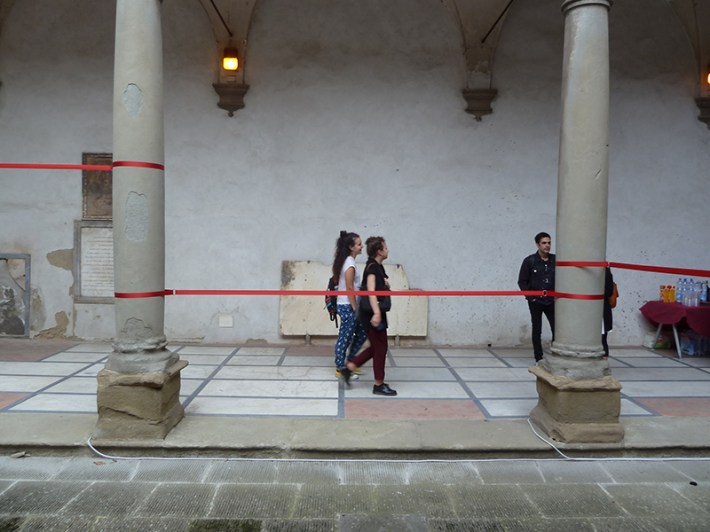 Chiostro di Levante – Spazio Labirinto, istallazione di Mauricio Lupini. Le linee rosse inserite nello spazio rinascimentale riportano le proporzioni del complesso 23 Enero, progettato a Caracas da Carlos Raul Villanueva nei primi anni cinquanta. (9 – 26 ottobre) Saletta ex- Presidenza – proiezione del video Hope di Ciboideale e Martino Chiti che descrive la situazione dei migranti accampati, nel luglio di quest’anno, sugli scogli di Ventimiglia al confine tra Italia e Francia, dopo l’improvvisa chiusura della frontiera, e documenta l’installazione artistica di Andrea d’Amore creata sul Sentiero della speranza (9 ottobre).
