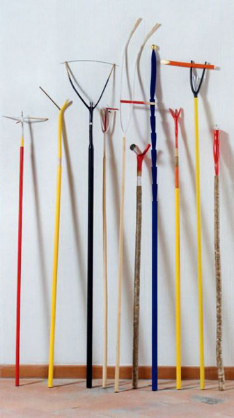 Jorge Eielson, artista e poeta, con Codice sul volo degli uccelli e sugli annodamenti di Leonardo, propone una duplice e complessa lettura; da un lato è evidente l’omaggio colto al celebre artista-scienziato e ai valori della cultura universale, dall’altro l’annodarsi della tela riconduce a prodotti artigianali, i quipus incas annodati e coloratissimi, propri del Perù sua terra d’origine. Ritroviamo un doppio codice elevato e colto e a volte strettamente connesso con le memorie della cultura popolare anche in Vittorio Tolu; in Autoritratti, libro d’artista con pagine incollate, lo specchio coinvolge lo spettatore e lo invita, riflettendosi, a superare il supporto, citando anche un preciso riferimento all’operato di Lucio Fontana; nella serie delle Iconostasi, lunghi bastoni capaci di assimilarsi a ogni sorta di mitici folletti, il riferimento immediato, invece, è con le tematiche dell’antica tradizione contadina della Sardegna. Anche La Cova di Gianni Ruffi vincola la sua storia alla memoria popolare, in questo caso la campagna toscana; la saldatura concentrica e rigorosa delle trappole e la sagoma fine delle uova in ferro, tuttavia, spostano l’opera verso un contesto più antinaturalistico e più legato alla realtà industriale. Una lettura del mondo che vediamo esaltata nelle opere in gomma di riciclo di Luca Matti; il suo Aereonautico, oscuro e sospeso tra le arcate del rinascimentale Chiostro di Levante, sembra svilupparsi dal cielo plumbeo di sconfinate periferie ed evocare gli incubi di certe sceneggiature B-movie. Sceglie, invece, il gusto per un’oggettualità squisitamente tattile Anna Rose, che lavora con soffici capelli biondi, trattenuti da nastri di raso, dichiarata metafora del femminile.